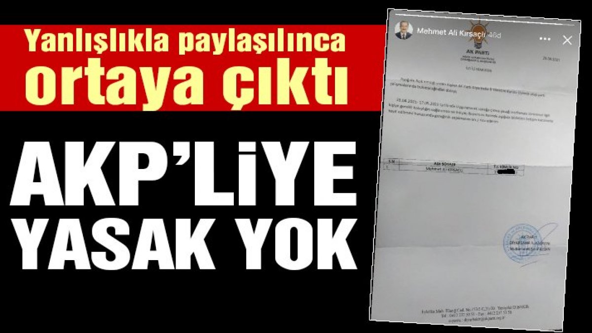 AKP Diyarbakır il başkanlığı tam kapanma döneminde AKPli il yöneticileri için “parti çalışmaları yürütüyor olmaları" gerekçesiyle izin belgesi verdiği iddia edildi. AKP İl Yönetim Kurulu Üyesi Mehmet Ali Kırsaçlı, sosyal medya hesabından il başkanlığı tarafından düzenlenen izin belgesini sosyal medya hesabından paylaştı.