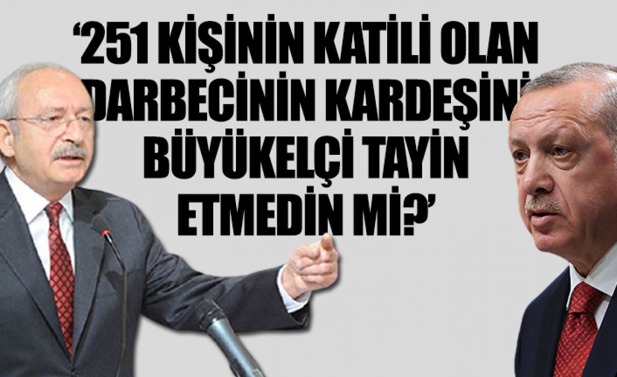 Kılıçdaroğlu, "Neymiş efendim, bazı imzacı emekli amirallerin eşleri, kardeşleri CHP’liymiş. Şu zekâya bak Allah aşkına. Bu aklı size kim veriyor? Eğer sen darbeci akrabası arıyorsan ben sana söyleyeyim, 251 kişinin katili olan darbecinin kardeşini büyükelçi tayin etmedin mi? Siz şehitlere bile saygı duymuyorsunuz. İstiyorsan şehit ailelerine soralım ne diyecek?" diye belirtti.