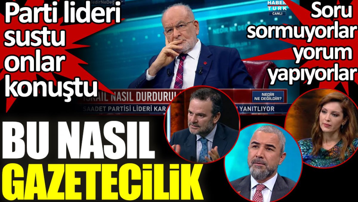 Dün akşam Habertürk TVye konuk olan Saadet Partisi Genel Başkanı Temel Karamollaoğlu’nun katıldığı programda Karamollaoğlu’nun değerlendirmeleri yerine ona soru sorması gereken gazetecilerin sürekli kendi yaptığı yorumları öne çıkarması dikkat çekti. Programda ayrıca bir sorunun yanıtı beklenmeden diğerine geçildiği ve Temel Karamollaoğlu’nun sözünün sürekli kesildiği görüldü. Karamollaoğlu bu duruma program sırasında tepki gösterdi.